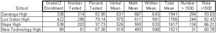 In a similar slight of hand, the Dec. 4, 2012 Board Materials provide dubious comparisons for New Technology High in Napa. Rather than comparing New Technology High at Napa to Napa High or our schools, there are county and national comparisons. For our district’s analysis, it is important to note that unlike Coppell High and Los Gatos High, Napa High is not a high performing high school. This table compares the SAT results at New Technology High at Napa with Napa High and the schools in the LGSUHSD.