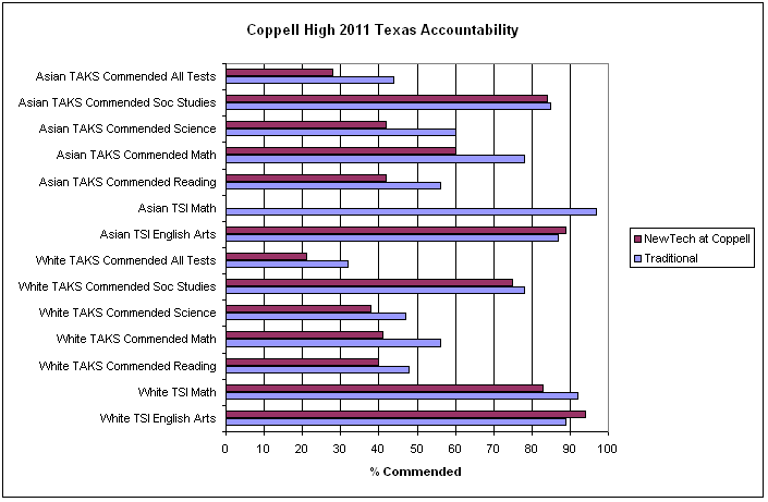 At the Nov. 13, 2012 Board Meeting, NewTech Networks presented Texas accountability data for Coppell High School in Dallas, Texas. The presentation has two parts. One part presents the testing data for Coppell High School. The other part is a narrative about NewTech High at Coppell. This is an artful misdirection. The State of Texas reports the NTN program at Coppell High separately from Coppell High School. Instead of presenting the testing data for the NTN program, the testing data that was presented was for the traditional high school. In Texas, “commended” corresponds to California’s Advanced and Proficient scores. These charts show the relative performance of the NTN program and the traditional program at Coppell High School. The first chart shows the Texas state standardized test results. With the exception of nominal improvement in English Arts scores, the NTN program reduced academic achievement. The second chart shows AP testing results.